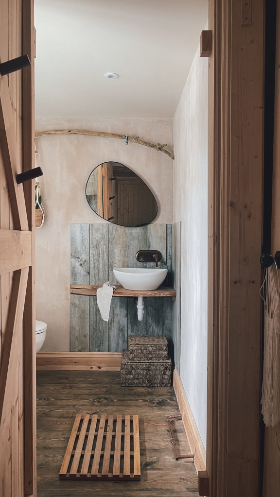 You’ve probably read the tricks every Interior Designer implements to make a small space feel bigger, and that likely includes installing a large mirror to reflect the light. That’s not why I installed this mirror. I wanted to draw visitors attention to the funky, wonky, organic mirror on the wall rather than focusing on the fact the bathroom is barely larger than a broom cupboard. Divert their attention elsewhere, and they won’t notice the small footprint. You can find a similar mirror here.